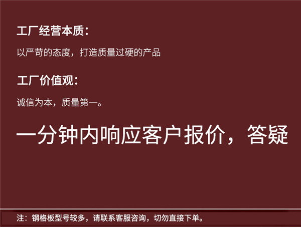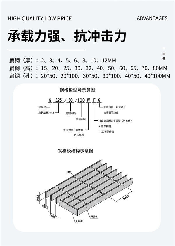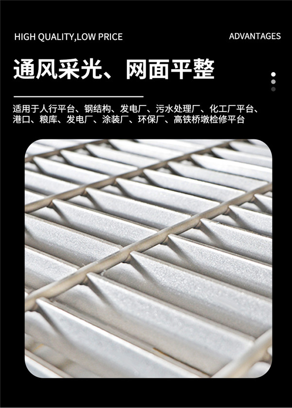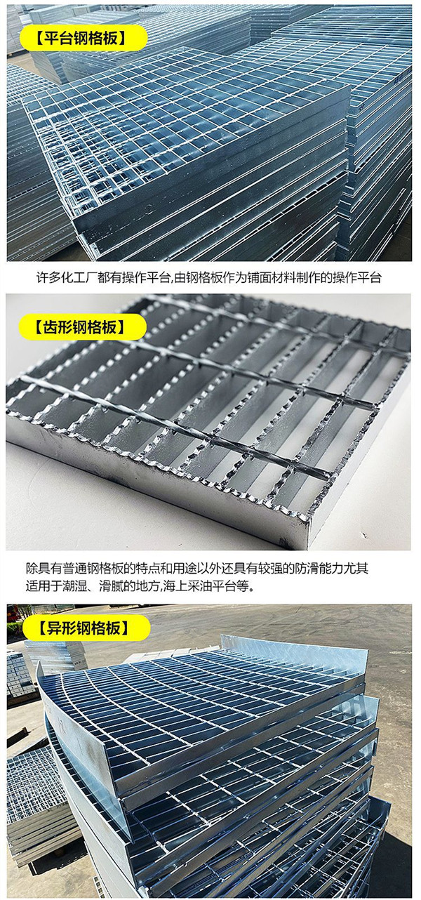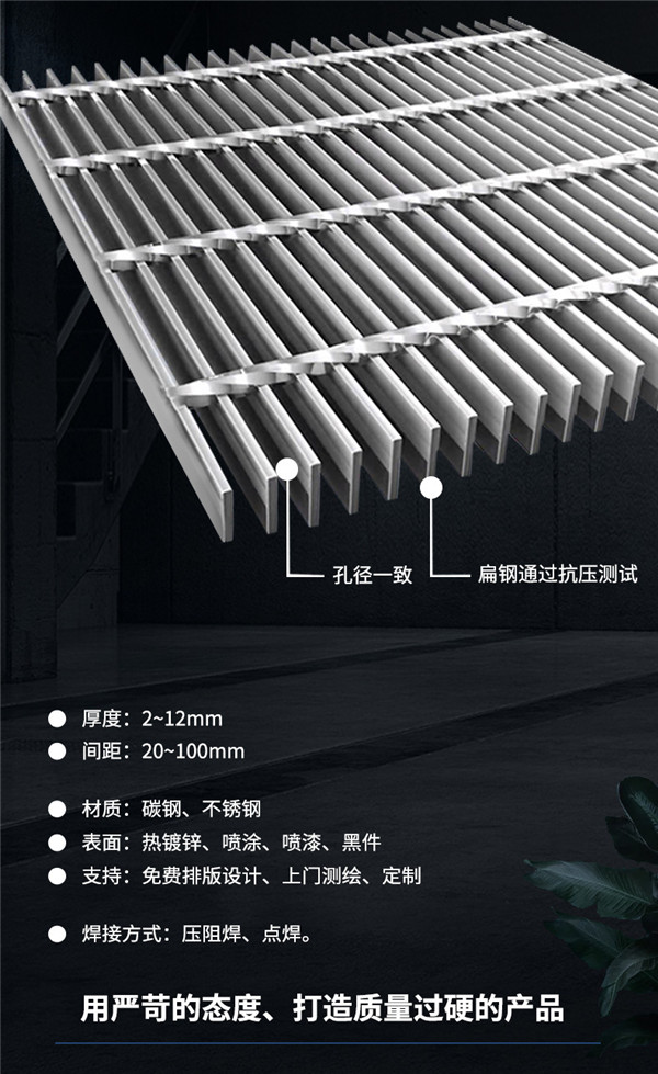 其除完全具備標準壓焊鋼格板的形式美觀、安裝簡便等優點外,更滿足了一些特殊場合對穿過或漏下物體的尺寸大小有嚴格要求的條件,比如人流較大民用場合,密型鋼格板可滿足女士高跟鞋行走的要求;再如人流較大的工礦企業中,要求不允許有較大物體(如直徑小于20mm鋼球)落下以滿足安全需要。